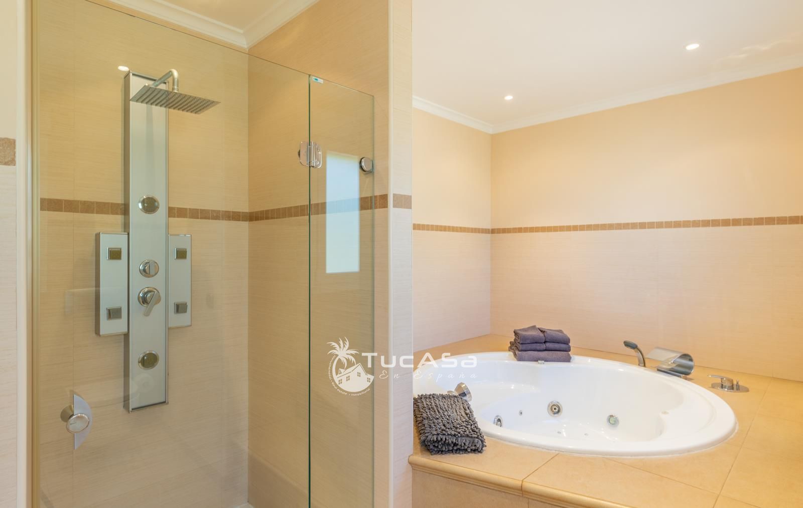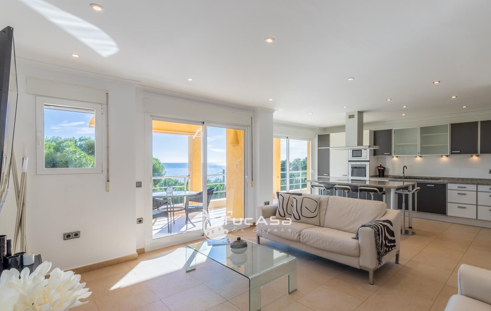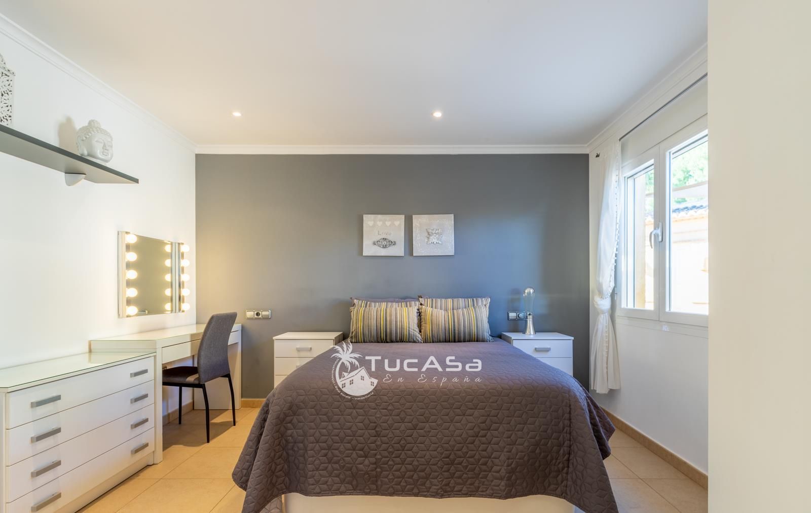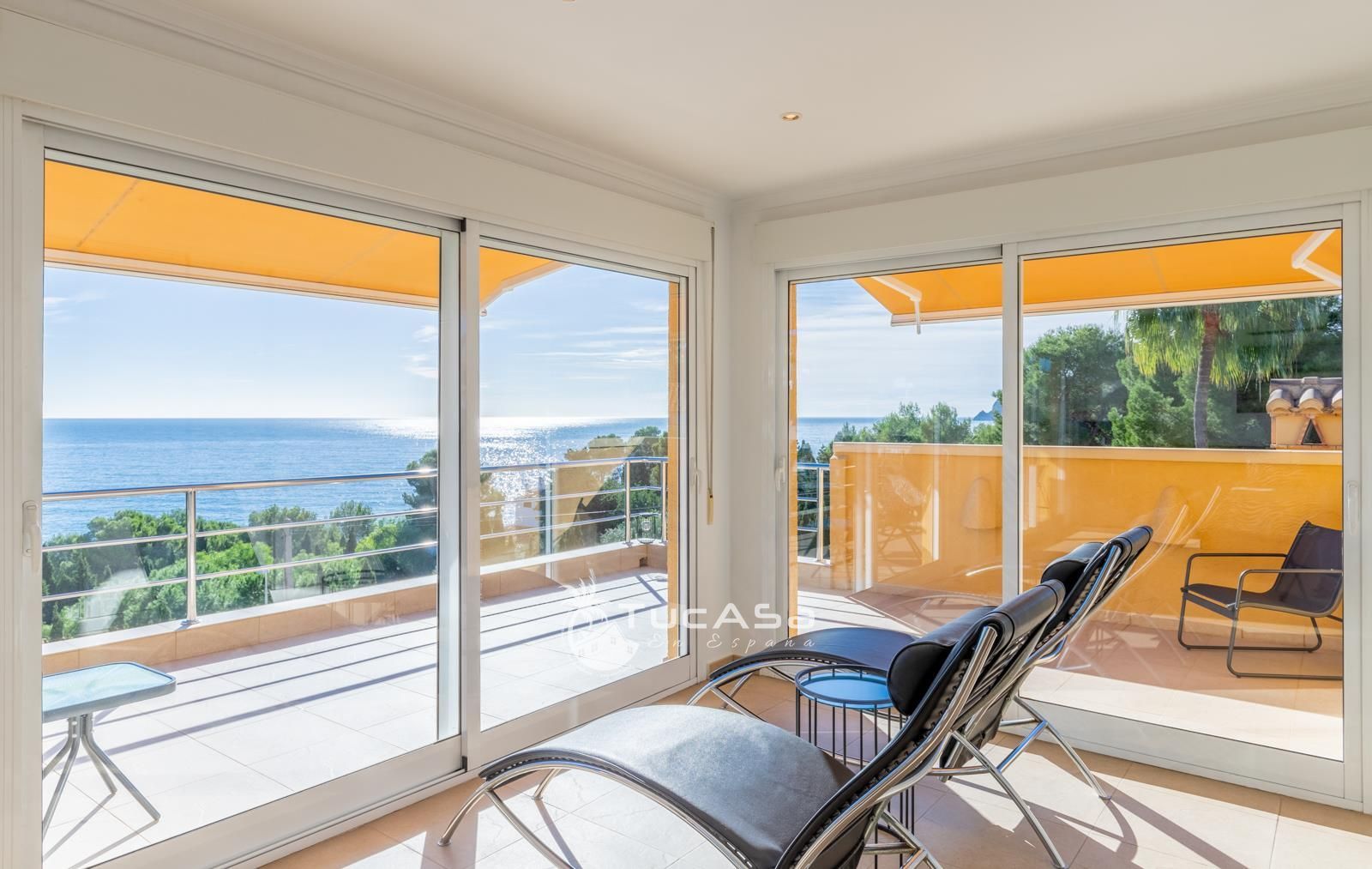 We are spoilt with panoramic sea views from most of the rooms of the house and all of the terraces. Outside is very private and we have lots of space to enjoy the sun and views, around the infinity swimming pool. The main living is very spacious, consists of an open-plan living room with fireplace, dining room and fully-equipped modern kitchen. Upstairs we find the master suite with the best views of the whole house, with access outside to a private terrace and a large en-suite bathroom with both shower and jacuzzi bath. The guest accommodation consists of an open-plan living room and fully-equipped kitchen. It has two double, en-suite bedrooms and a private terrace and lounging area.