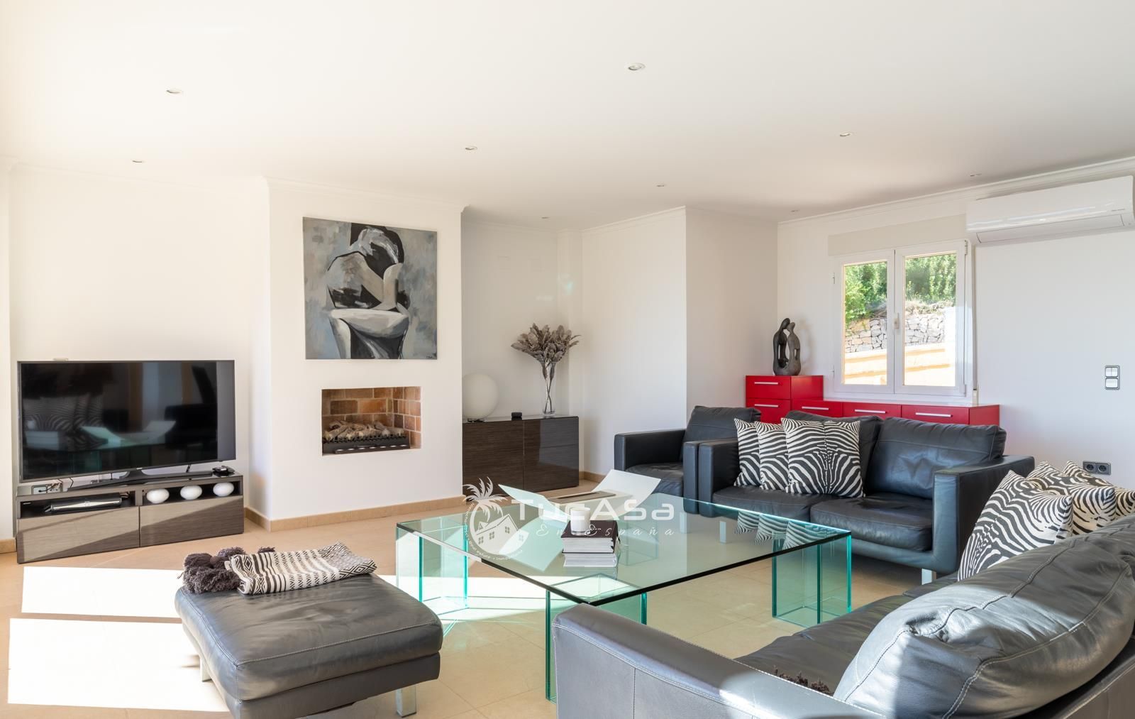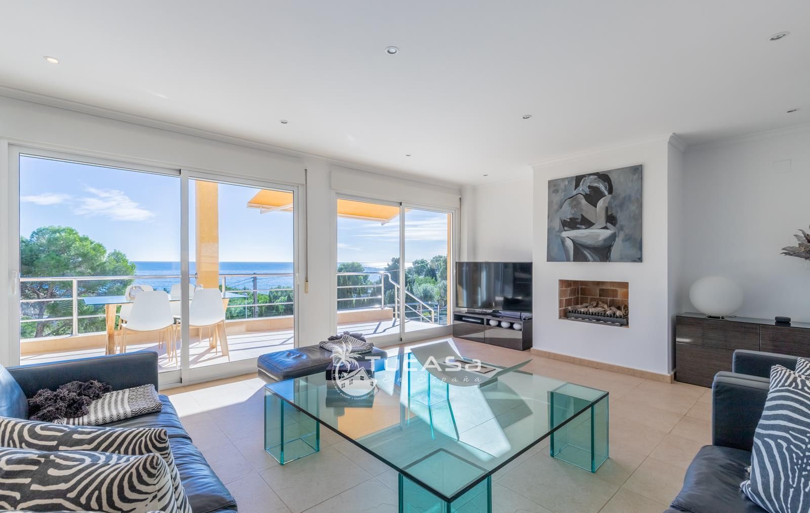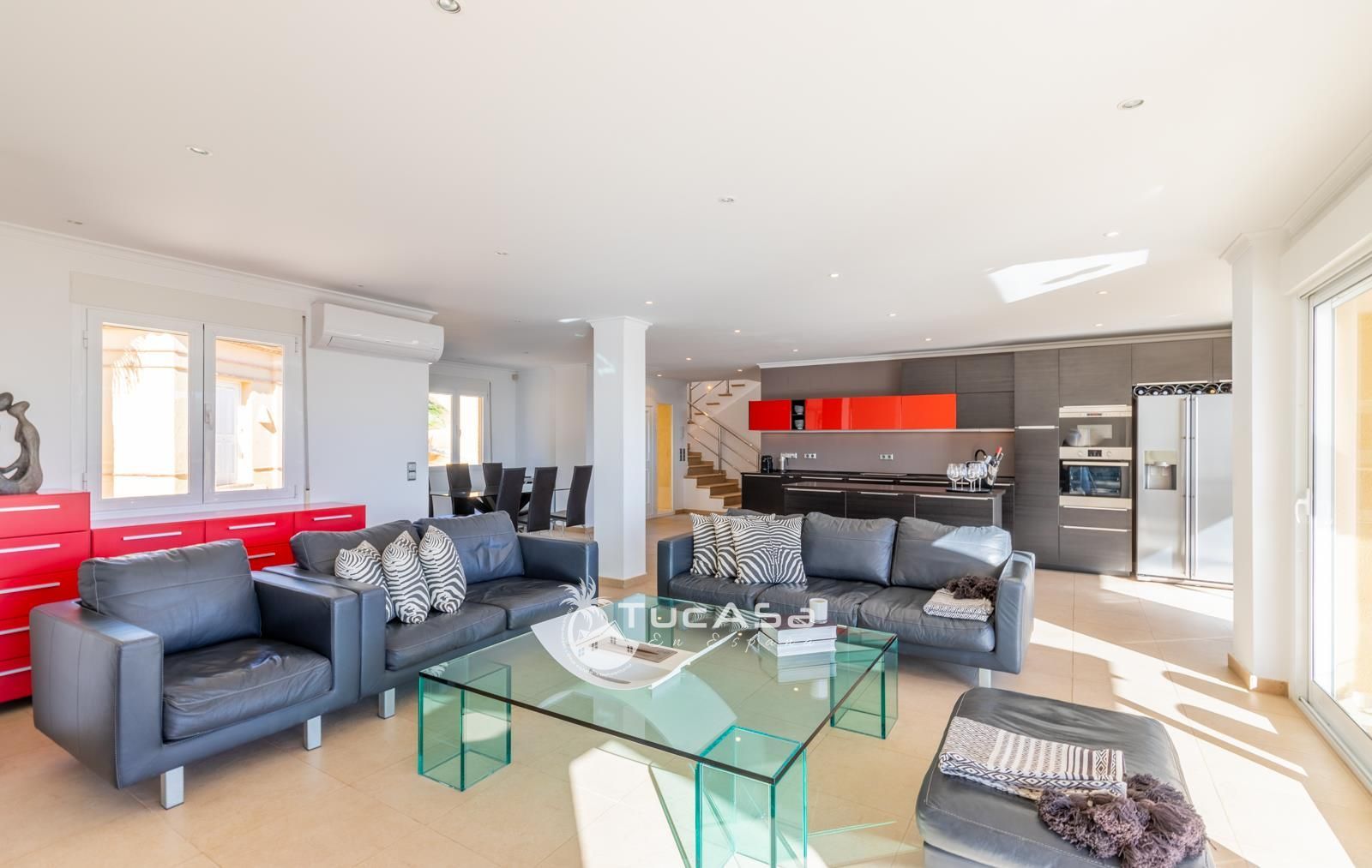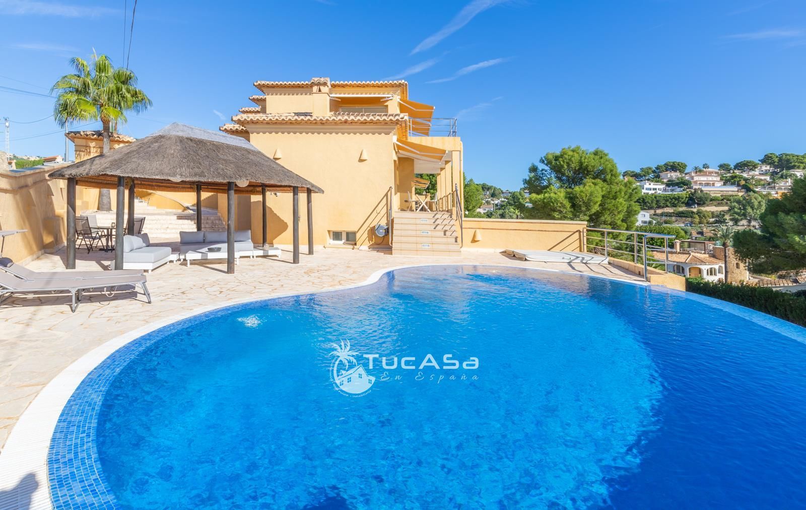We are spoilt with panoramic sea views from most of the rooms of the house and all of the terraces. Outside is very private and we have lots of space to enjoy the sun and views, around the infinity swimming pool. The main living is very spacious, consists of an open-plan living room with fireplace, dining room and fully-equipped modern kitchen. Upstairs we find the master suite with the best views of the whole house, with access outside to a private terrace and a large en-suite bathroom with both shower and jacuzzi bath. The guest accommodation consists of an open-plan living room and fully-equipped kitchen. It has two double, en-suite bedrooms and a private terrace and lounging area.