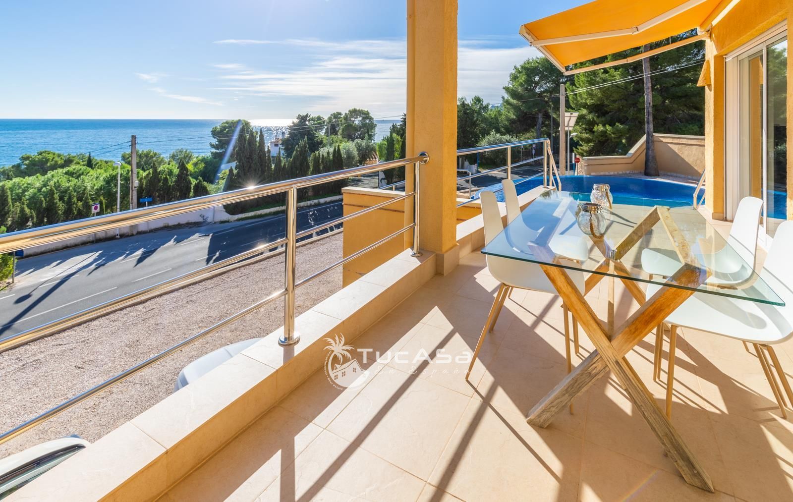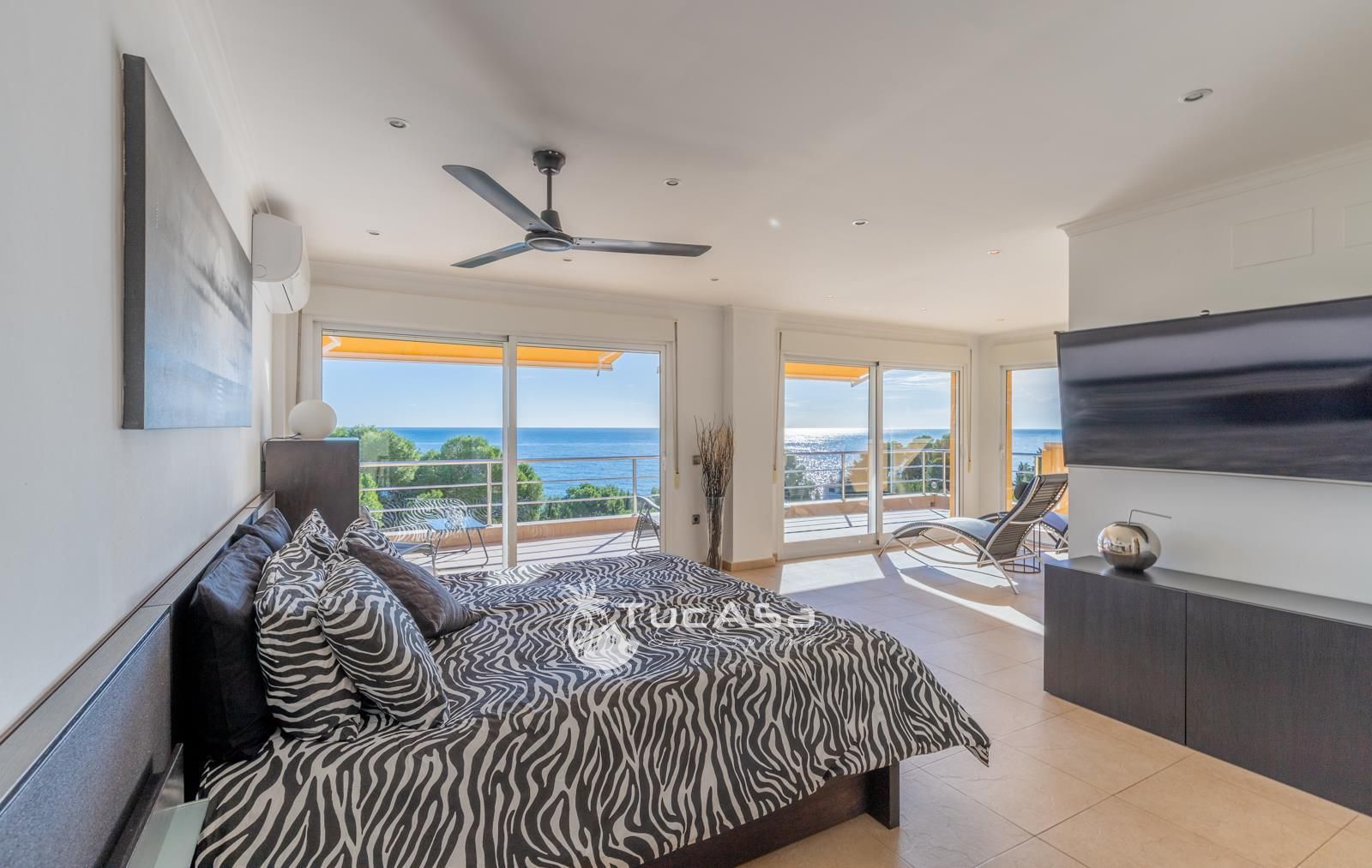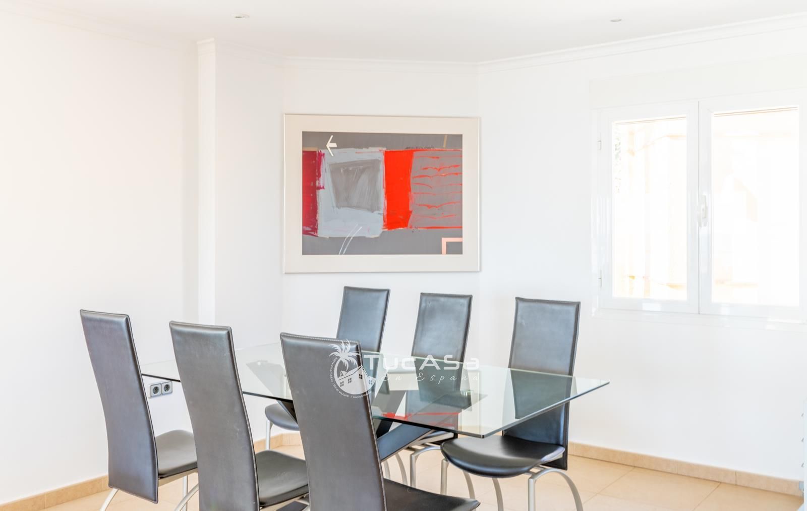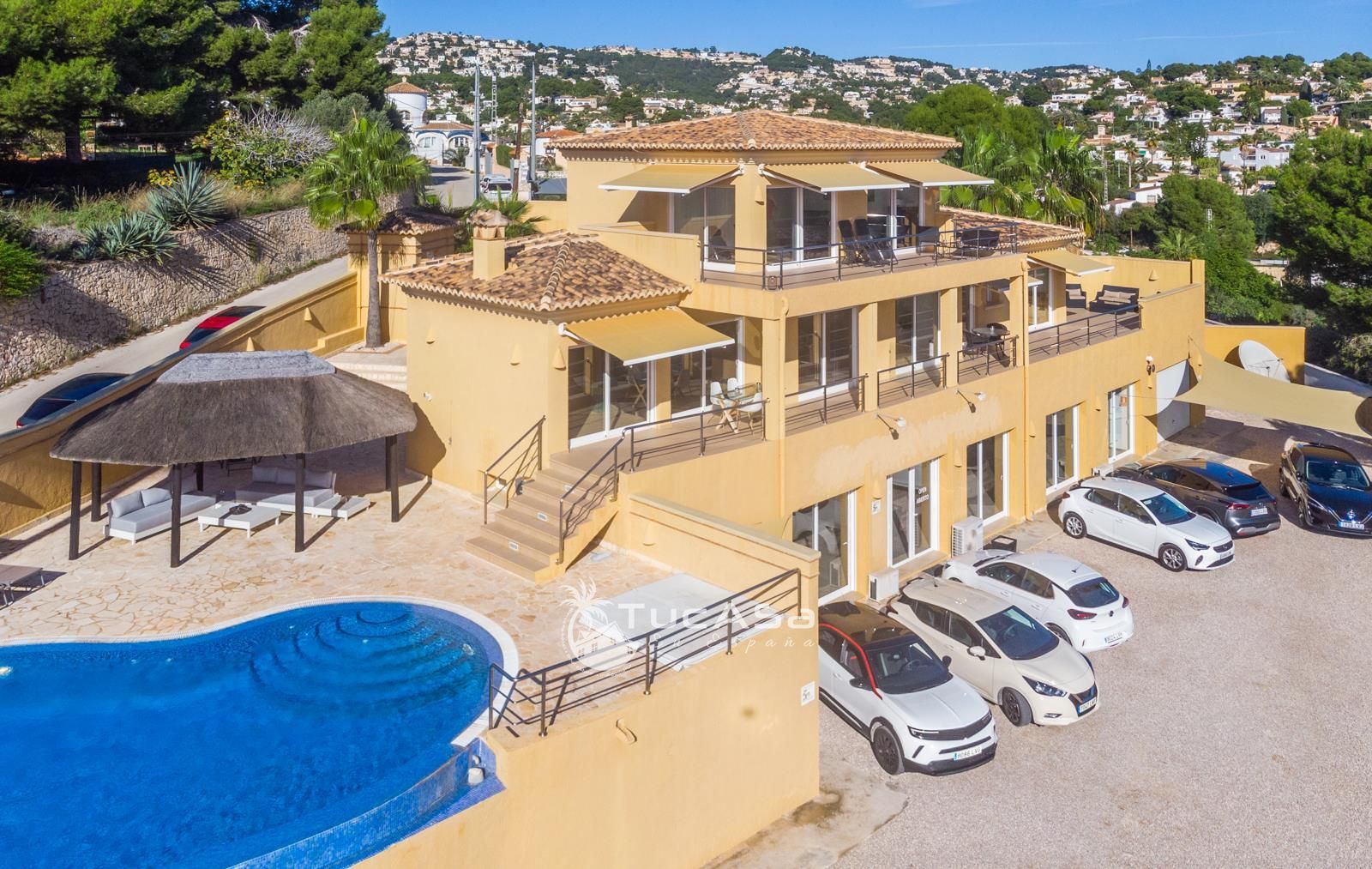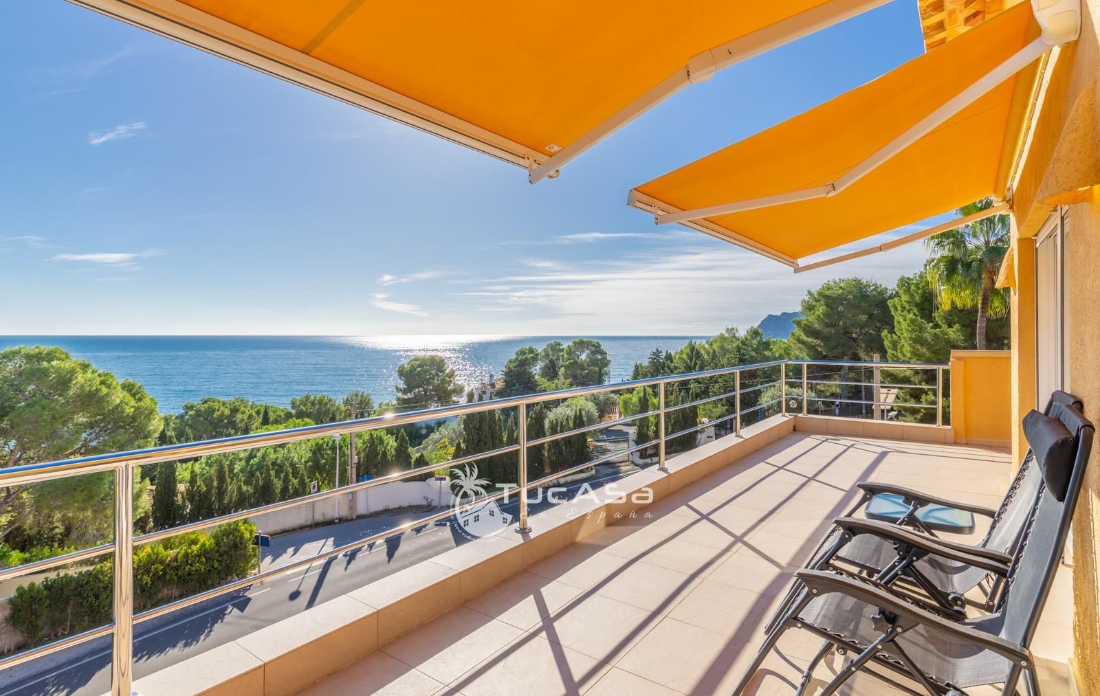 We are spoilt with panoramic sea views from most of the rooms of the house and all of the terraces. Outside is very private and we have lots of space to enjoy the sun and views, around the infinity swimming pool. The main living is very spacious, consists of an open-plan living room with fireplace, dining room and fully-equipped modern kitchen. Upstairs we find the master suite with the best views of the whole house, with access outside to a private terrace and a large en-suite bathroom with both shower and jacuzzi bath. The guest accommodation consists of an open-plan living room and fully-equipped kitchen. It has two double, en-suite bedrooms and a private terrace and lounging area.