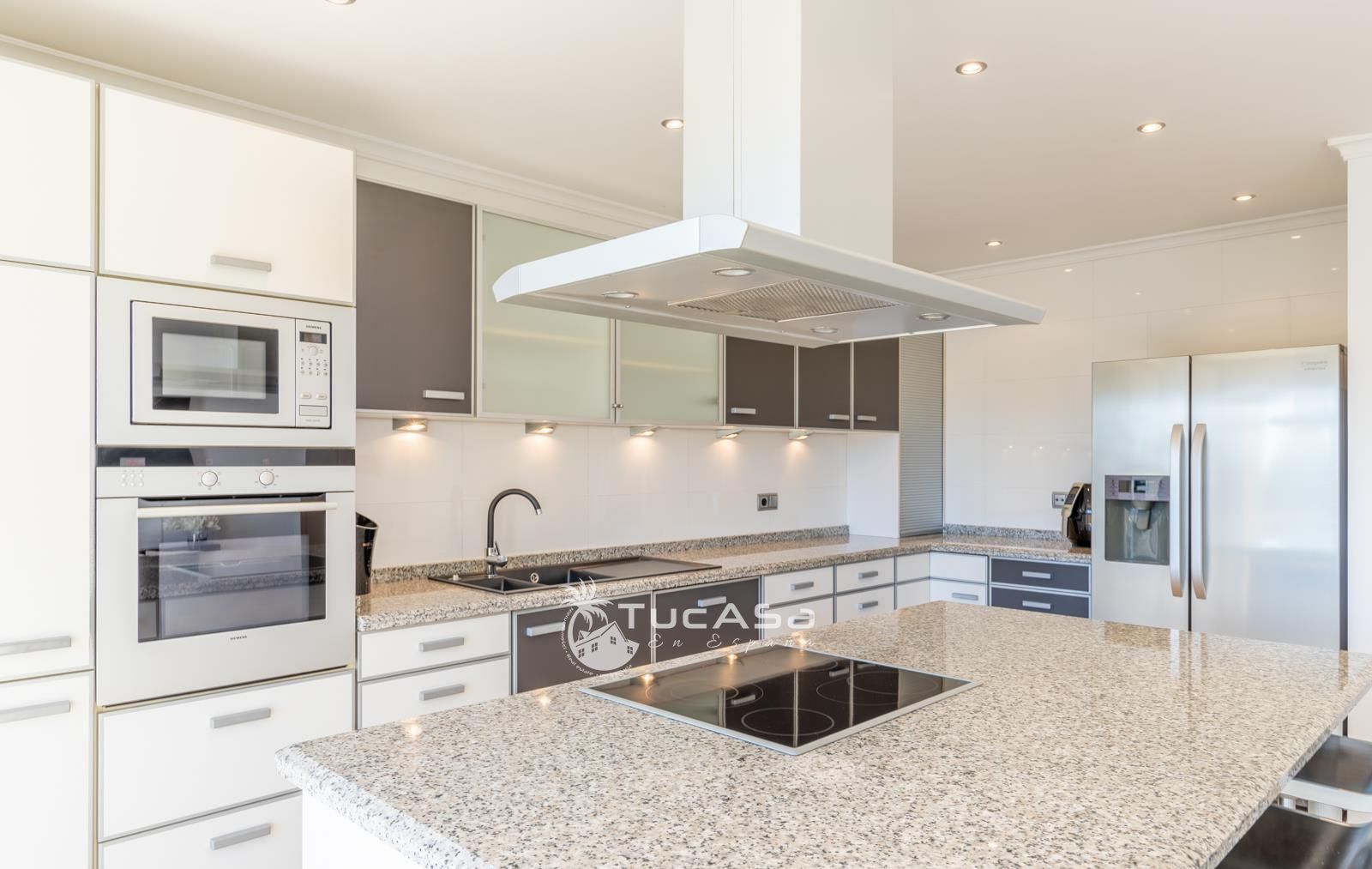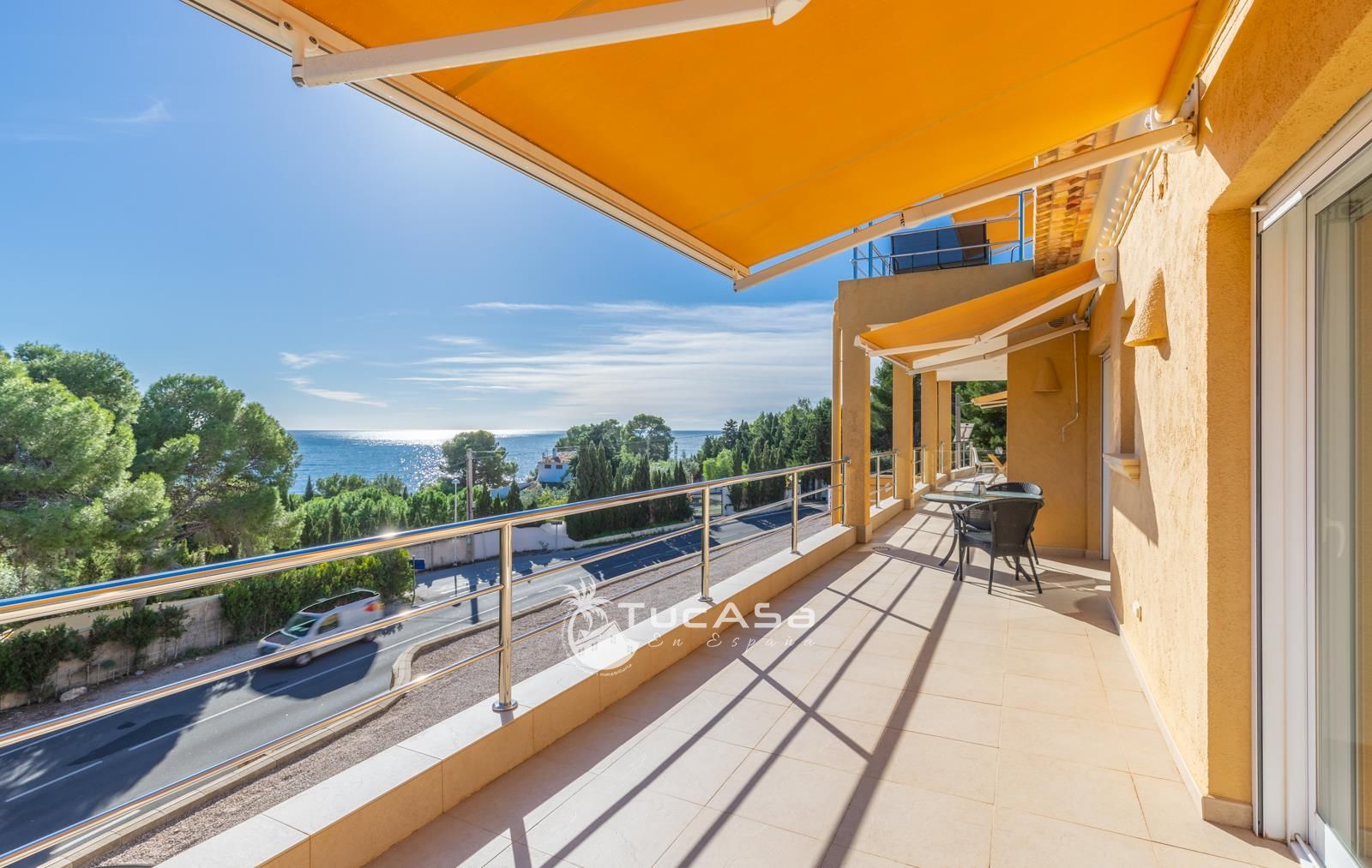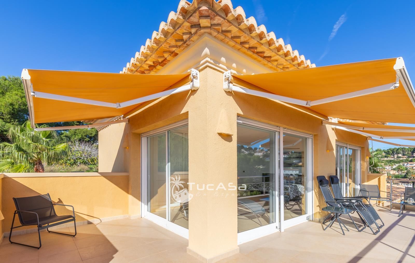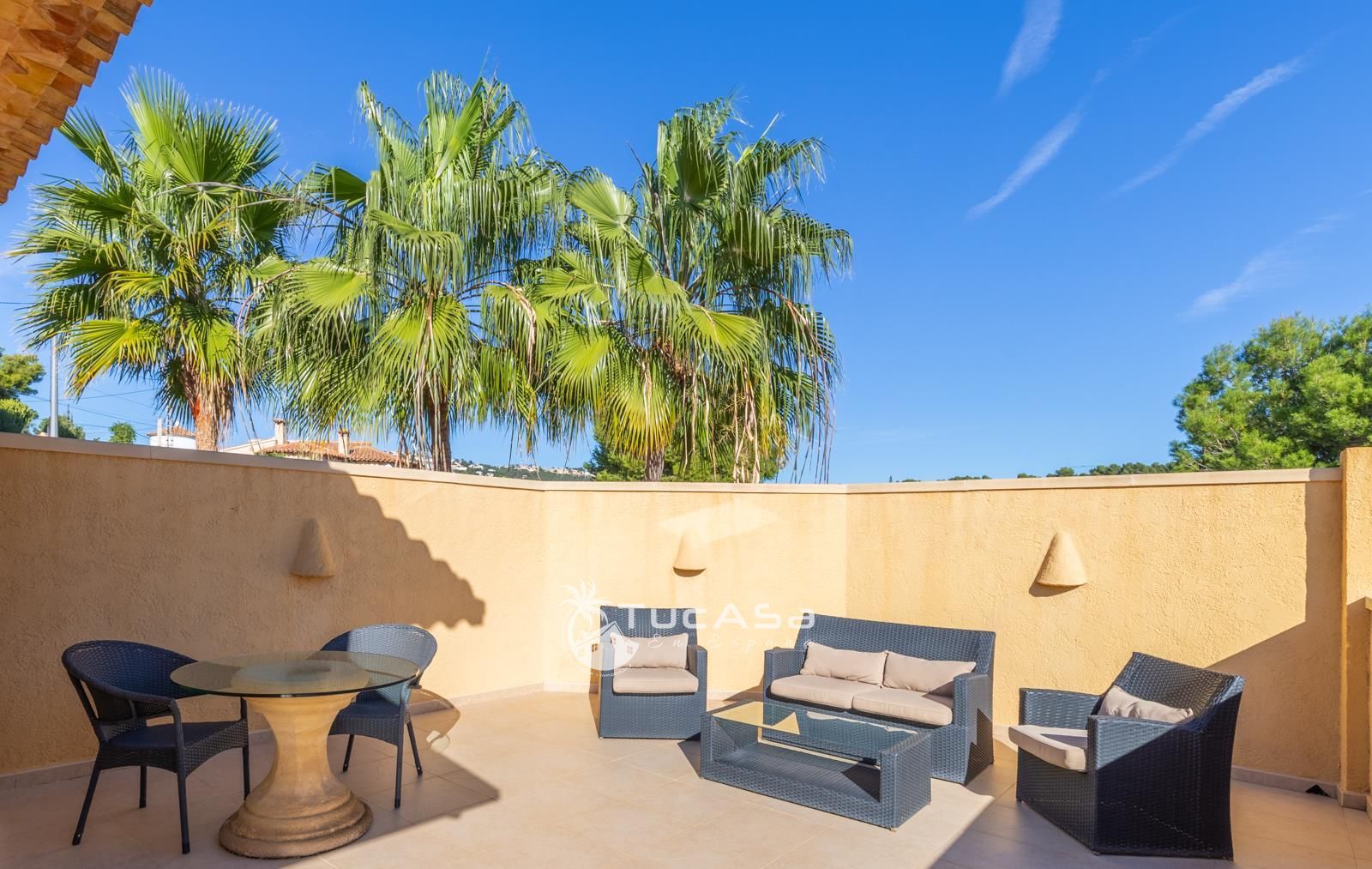 We are spoilt with panoramic sea views from most of the rooms of the house and all of the terraces. Outside is very private and we have lots of space to enjoy the sun and views, around the infinity swimming pool. The main living is very spacious, consists of an open-plan living room with fireplace, dining room and fully-equipped modern kitchen. Upstairs we find the master suite with the best views of the whole house, with access outside to a private terrace and a large en-suite bathroom with both shower and jacuzzi bath. The guest accommodation consists of an open-plan living room and fully-equipped kitchen. It has two double, en-suite bedrooms and a private terrace and lounging area.