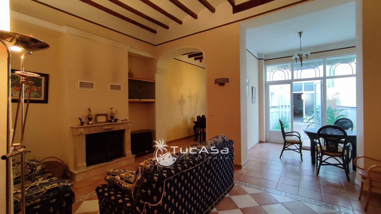 Amplio salón principal con dos ambientes diferenciados y acogedora chimenea.