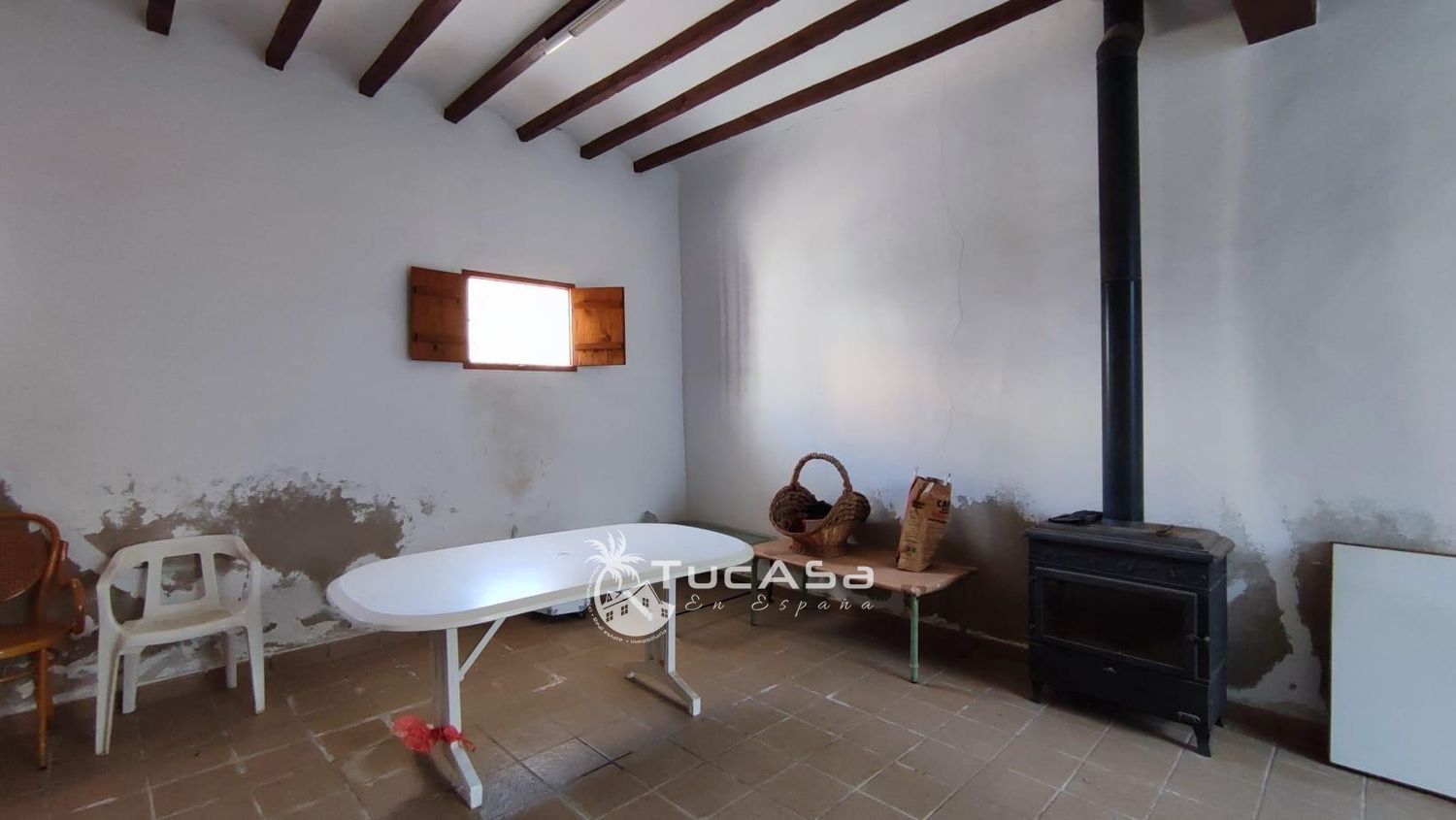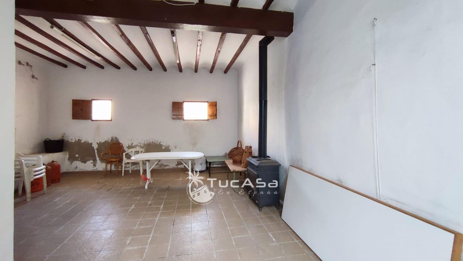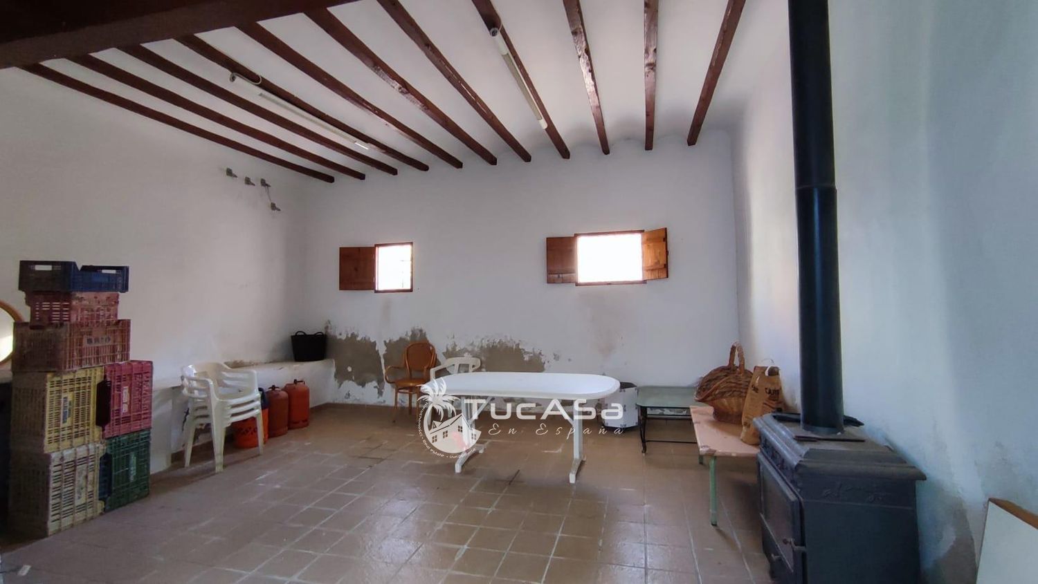 Sala multiusos diáfana con estufa de leña, perfecta para celebraciones, reuniones familiares o como sala de juegos.