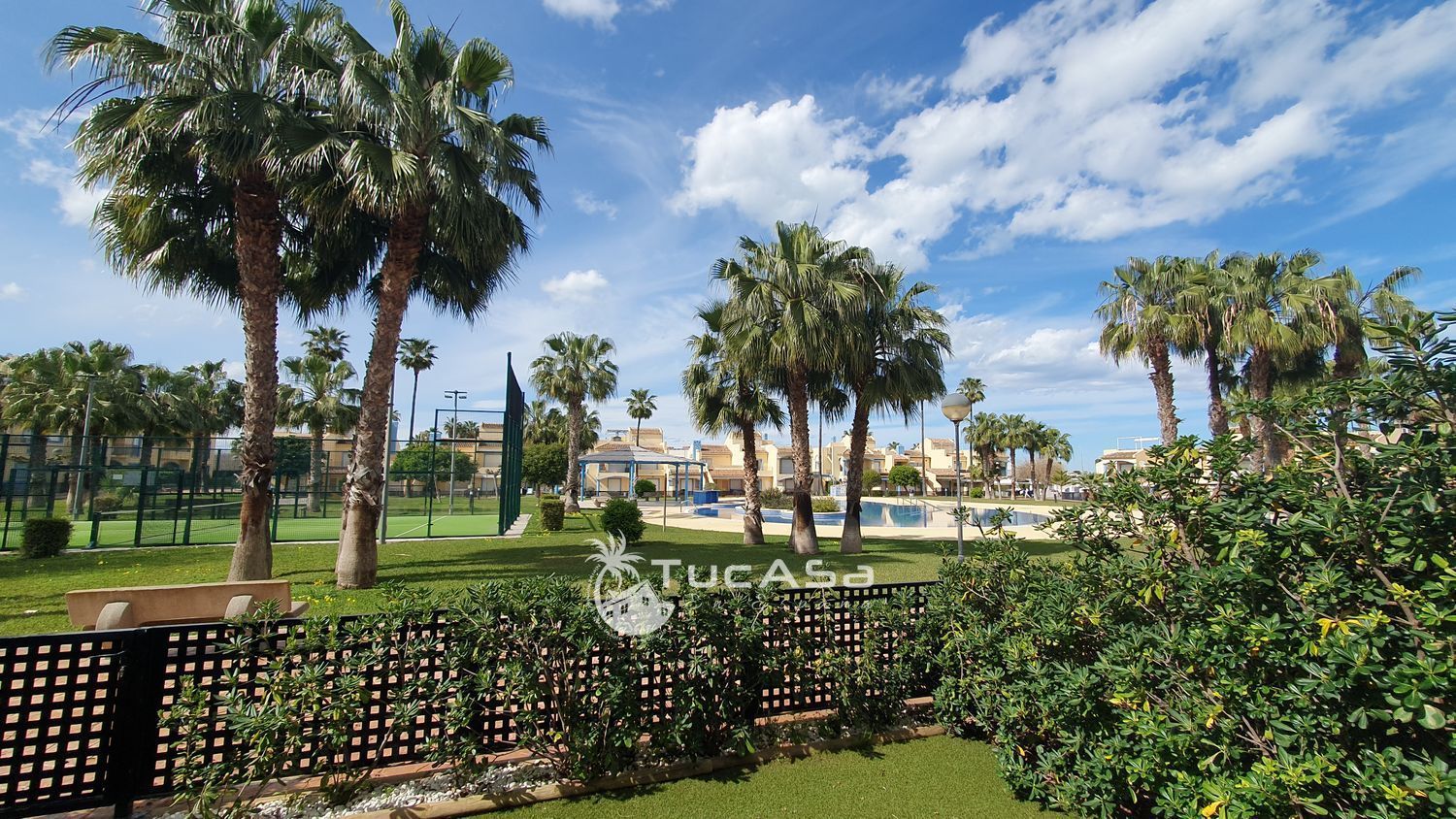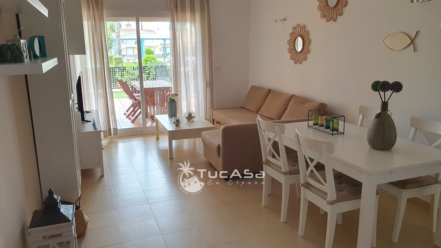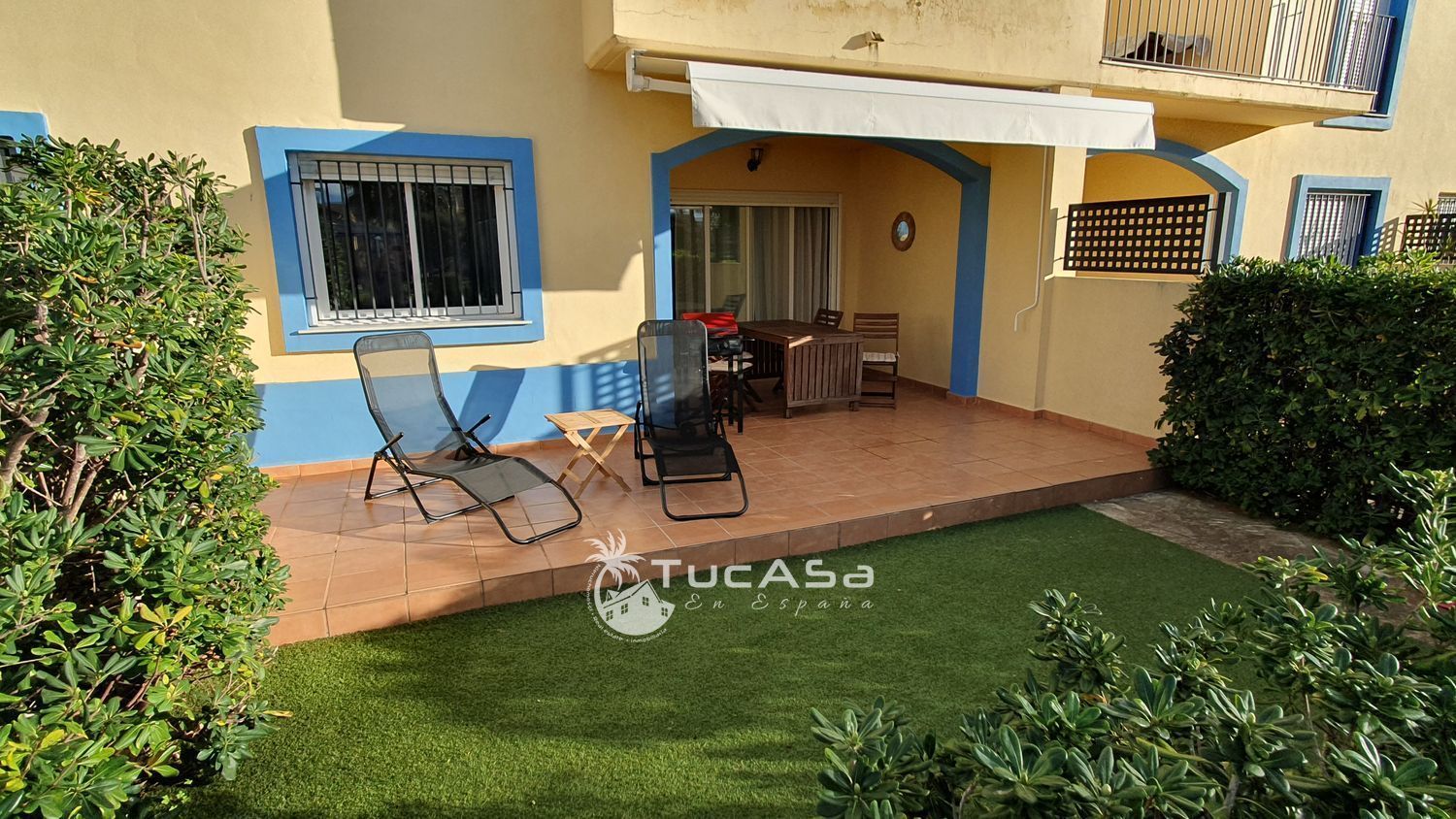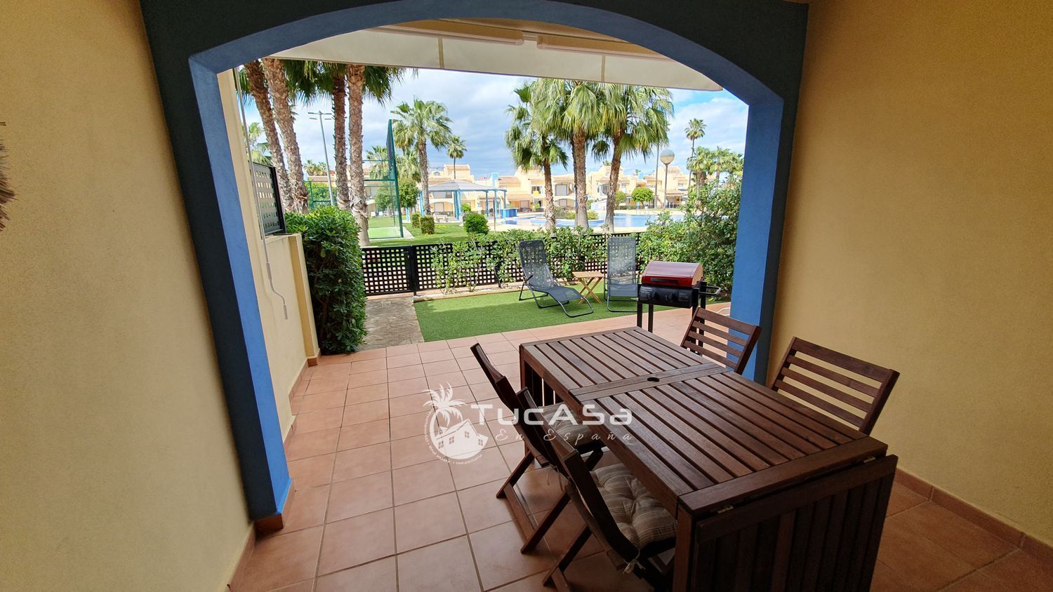 Precioso apartamento en planta baja con jardín privado. Totalmente amueblado, con electrodomésticos y alta en suministros de agua y luz; para entrar a vivir. Cuenta con cocina independiente con acceso a balcón-corredor abierto en fachada principal con armario de almacenaje/escobero y tejadillo para zona de lavandería. Dos dormitorios con armarios empotrados, dos baños (uno con plato de ducha y el otro con bañera). Amplio salón con salida a la terraza cubierta y jardín de uso privado, con acceso directo a las zonas comunes de la urbanización. Éstas constan de una amplia pradera, dos piscinas (una de ellas infantil), pista de pádel, pequeño parque para los niños y pérgola cubierta.
