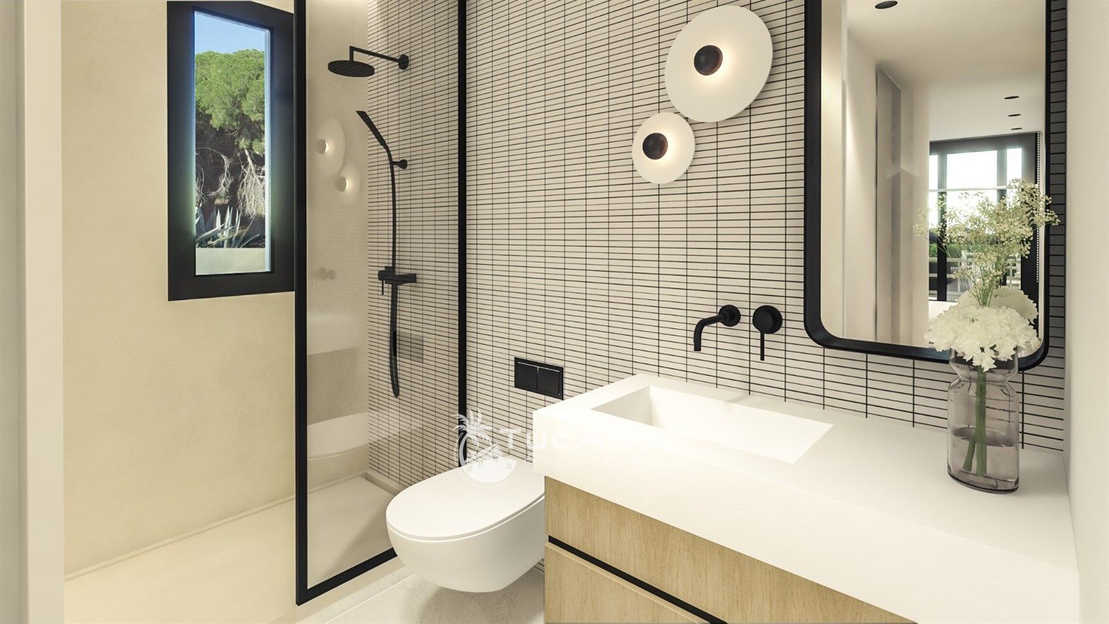 Los apartamentos de la planta baja tienen un jardín privado con terraza y acceso directo a la piscina comunitaria con zona para tomar el sol. Las viviendas incluyen 2 dormitorios, 2 baños y amplio salón con cocina americana equipada. Cada apartamento incluye una plaza de aparcamiento y un trastero. También hay aparcamiento para bicicletas.
